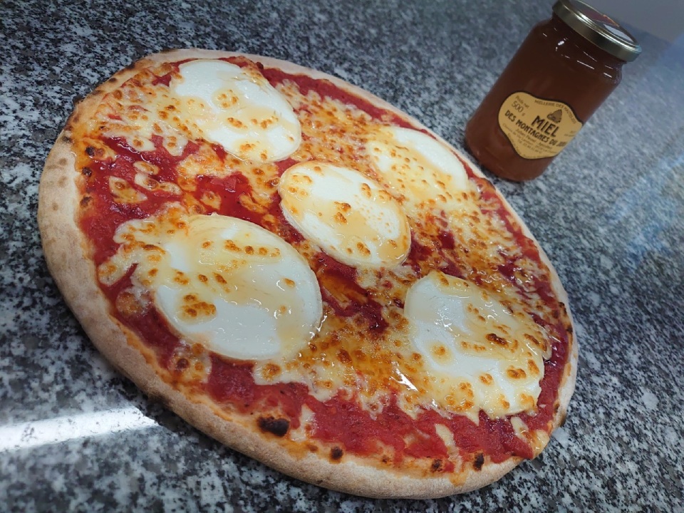 CHÈVRE MIEL du JURA : tomate, fromage de chèvre, miel, mozzarella.