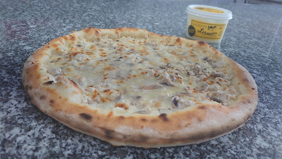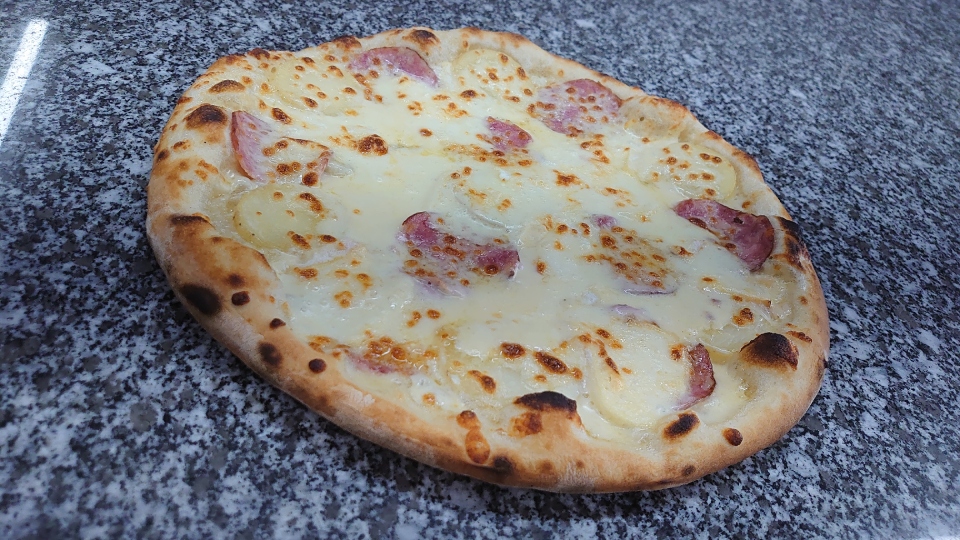 MORBIFLETTE : crème fraîche, oignons jaunes, pomme de terre, lardons, morbier, mozzarella.