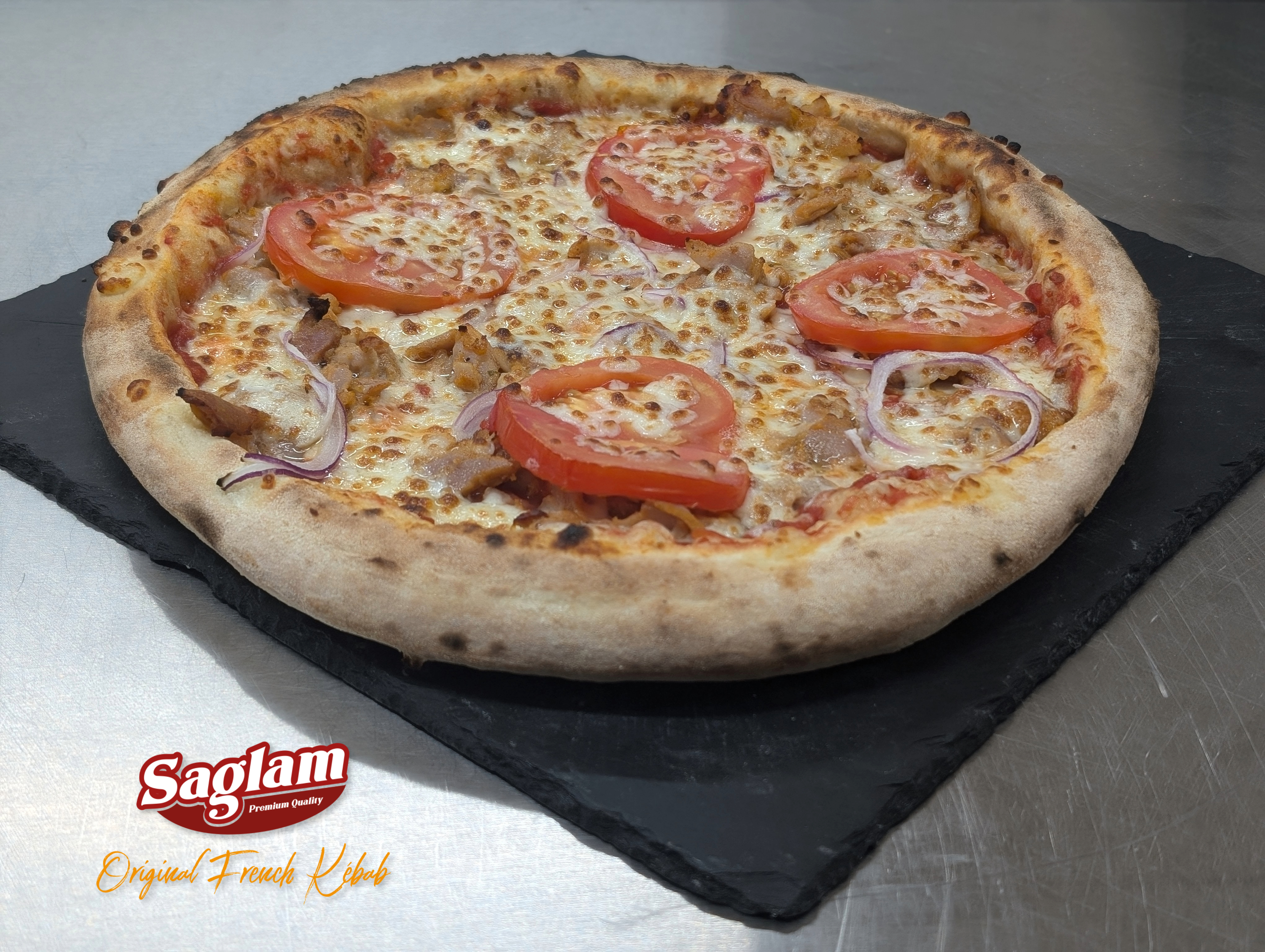 KEBAB : tomate, oignons rouges, tomate fraîche, viande kebab*, sauce pitta, mozzarella.