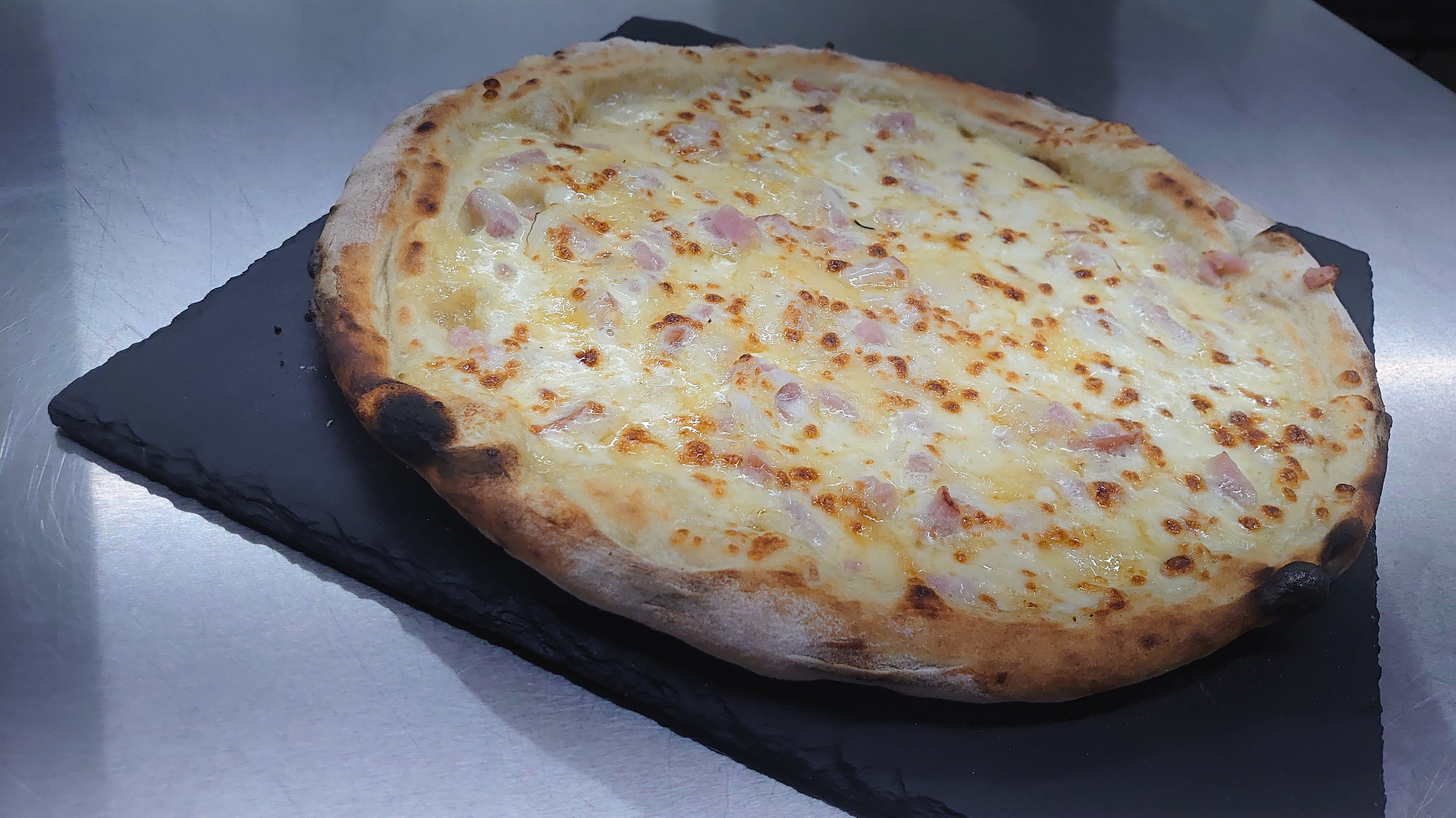 CARBO JURASSIENNE : crème fraîche, lardon de dinde*, oignons jaunes, mixte de fromage Jurassien, mozzarella
