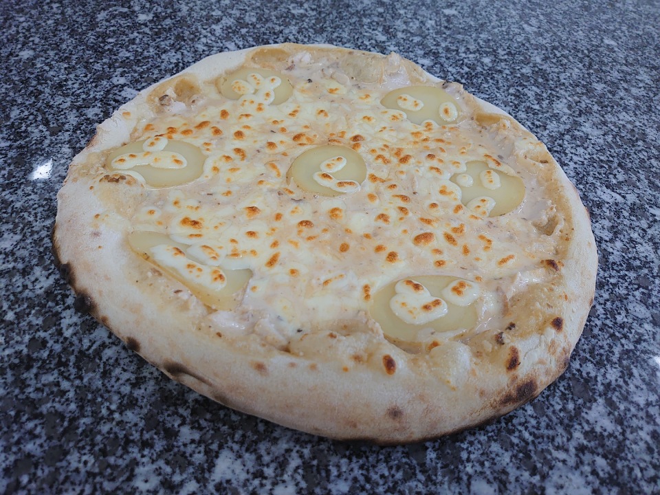 POULET CURRY : crème fraîche, poulet*, oignons rouges, pomme de terre, sauce curry, mozzarella.