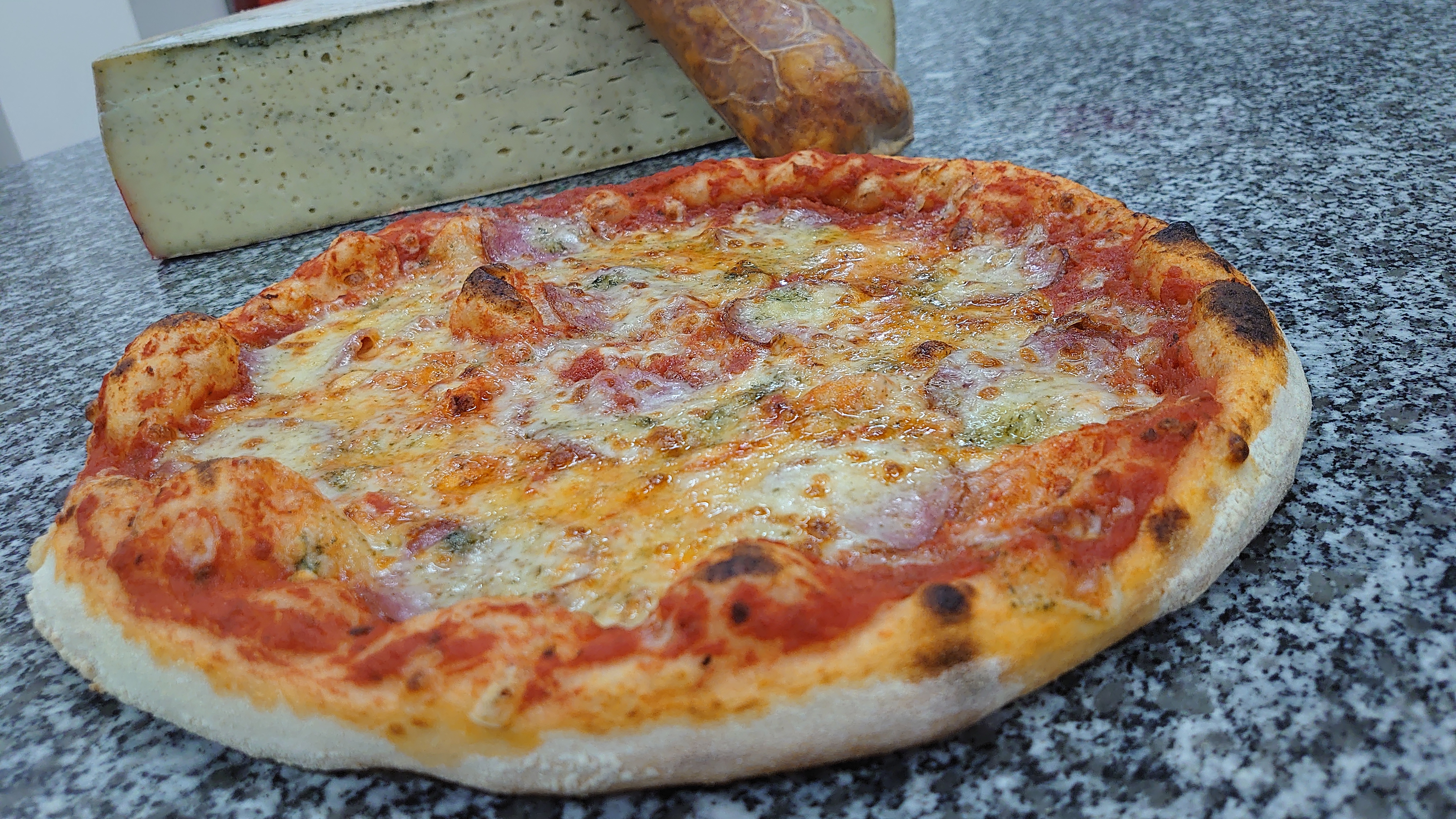 4 FROMAGES : tomate, bleu de Gex, Comté, Morbier, mozzarella.